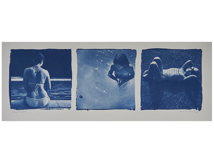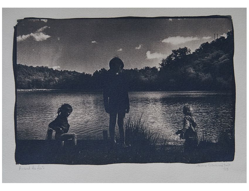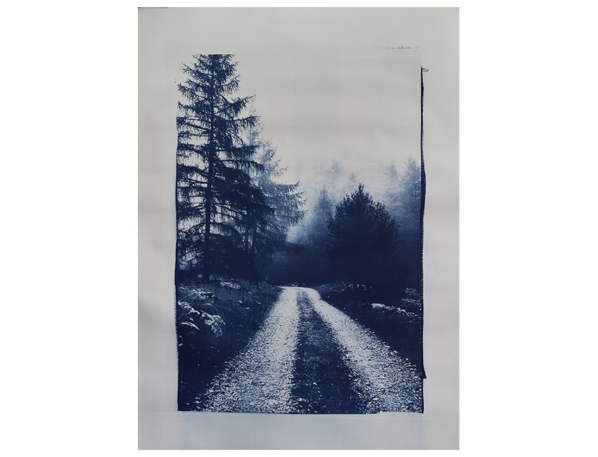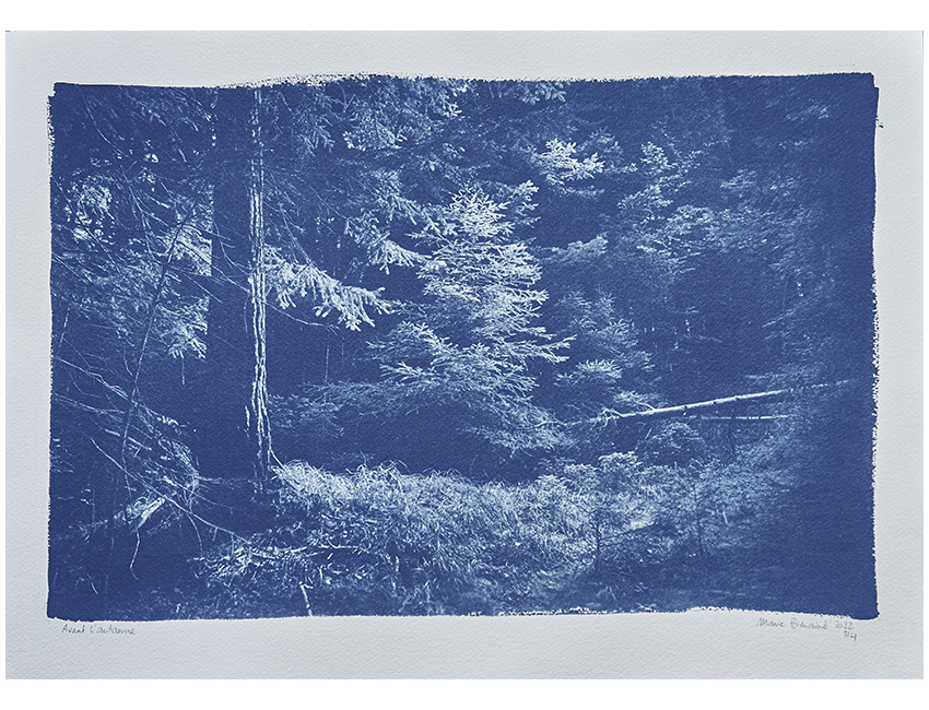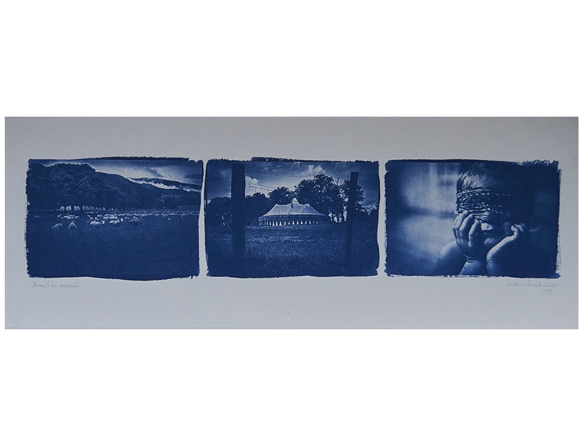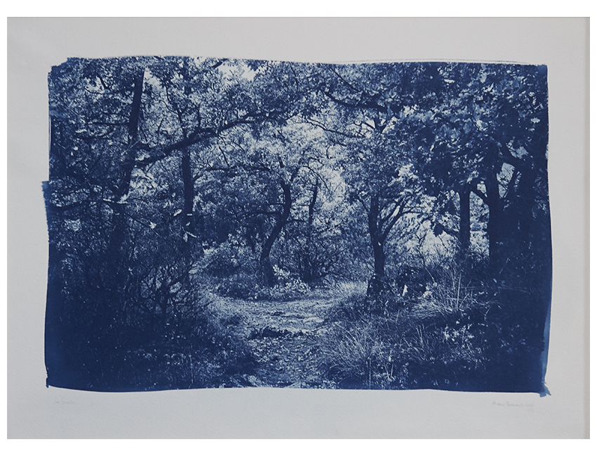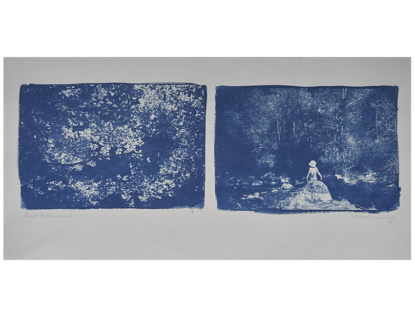 L’appui du cyanotype pour ce travail permet de se perdre plus facilement entre réel et fiction, entre avant et après, en jouant sur les émotions. Les diptyques et triptyques aident à construire le chemin imaginaire.